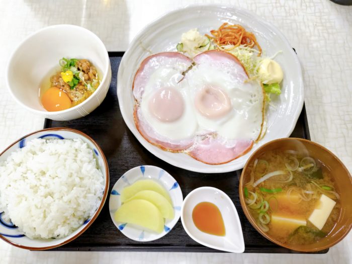ハムエッグ定食プラス納豆